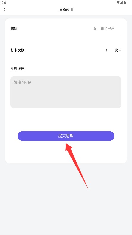 3、填寫愿望標題、設置打卡周期并補充詳細說明,確認后點擊提交愿望完成創建。