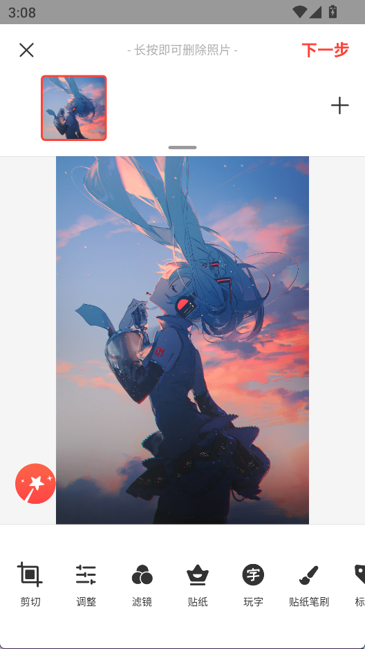 3、在底部工具欄選擇功能對圖片進行處理,有剪切、濾鏡、貼紙等多種編輯功能