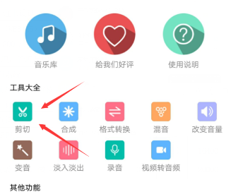 1、剪切器有兩個(gè)入口,首先可以點(diǎn)擊首頁(yè)的剪切按鈕進(jìn)入剪切器,也可以在樂(lè)庫(kù)列表的更多菜單里面點(diǎn)擊剪切進(jìn)入剪切器。