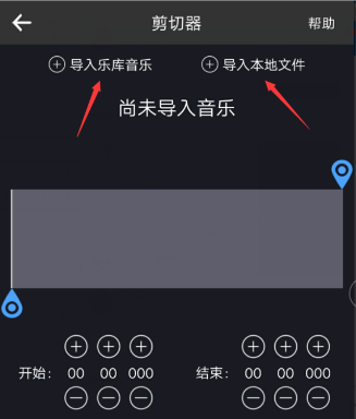 2、在開(kāi)始剪切音樂(lè)之前,首先需要導(dǎo)入音樂(lè),如果您還沒(méi)有導(dǎo)入音樂(lè),可以點(diǎn)擊上方的"導(dǎo)入樂(lè)庫(kù)音樂(lè)"和"導(dǎo)入本地文件"兩個(gè)按鈕,分別用兩種不同的方式導(dǎo)入音樂(lè)。