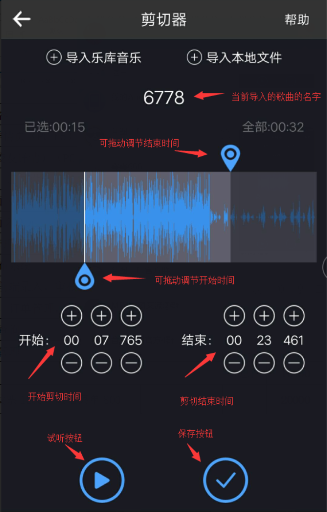 3、導(dǎo)入了音樂(lè)之后,可以拖動(dòng)調(diào)節(jié)并始和結(jié)束時(shí)間,也可以通過(guò)按鈕,調(diào)節(jié)完成之后點(diǎn)擊保存即可。如果您需要去掉歌曲中間的桌個(gè)部分,只能是將音樂(lè)的開(kāi)頭可結(jié)尾分別剪切出來(lái),然后再合成起來(lái)。