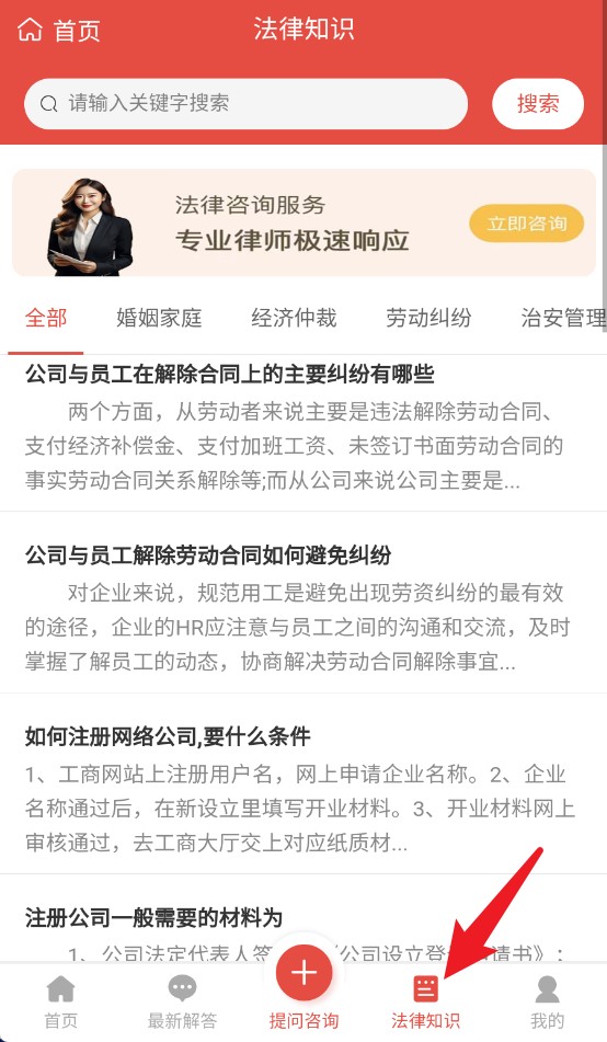 4、法律知識板塊提供各類常見法律問題的知識文章,勞動糾紛等領域,便于用戶學習了解相關法規。
