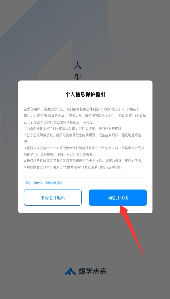 1、首次啟動應(yīng)用時(shí),系統(tǒng)會彈出用戶協(xié)議界面,仔細(xì)閱讀后點(diǎn)擊同意并繼續(xù)按鈕即可進(jìn)入下一步。