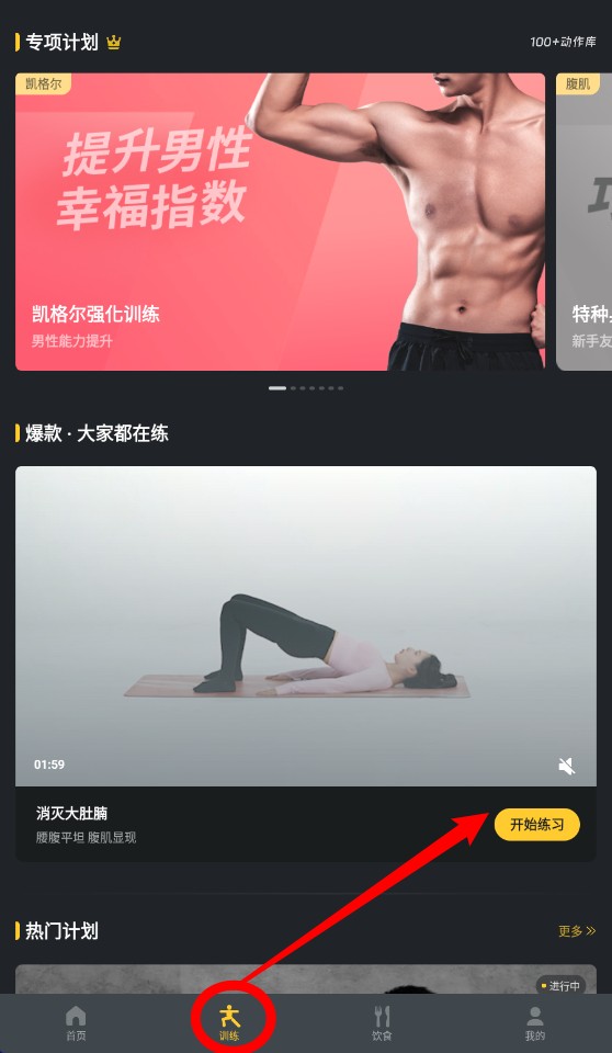 2、首頁點擊訓練標簽,瀏覽推薦課程,選擇適合的訓練項目。