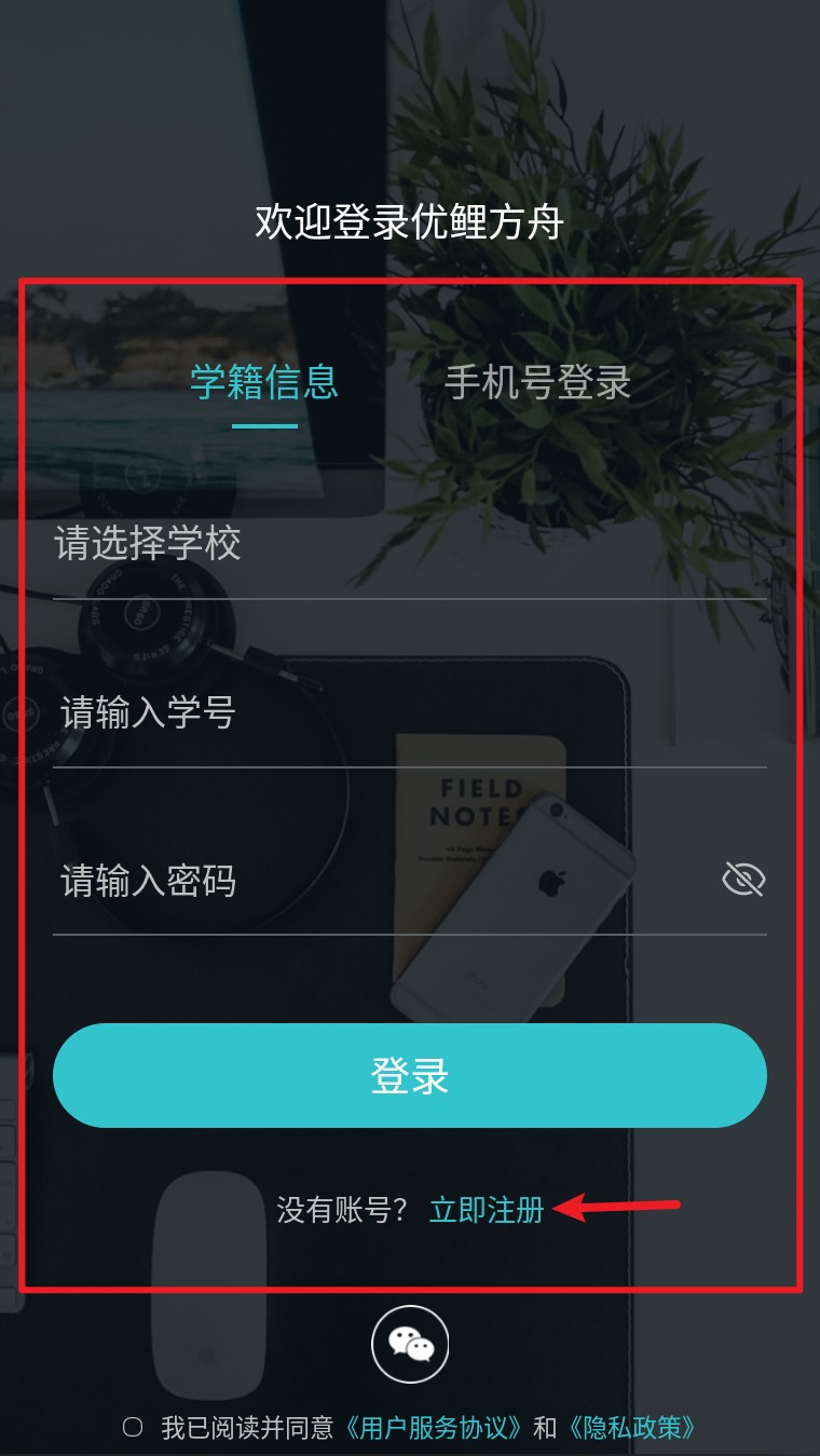 1. 打開App進入登錄界面,選擇學籍信息登入方式,輸入學校、學號與密碼即可。