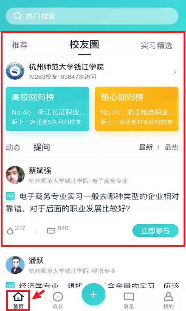 3. 登錄成功后自動跳轉首頁,點擊下方導航欄中的首頁可查看推薦與校友圈。