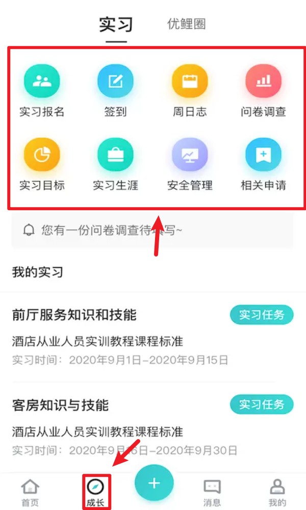 4. 進入首頁后點擊底部成長頁簽,進入實習相關功能區域,查看任務與進度。
