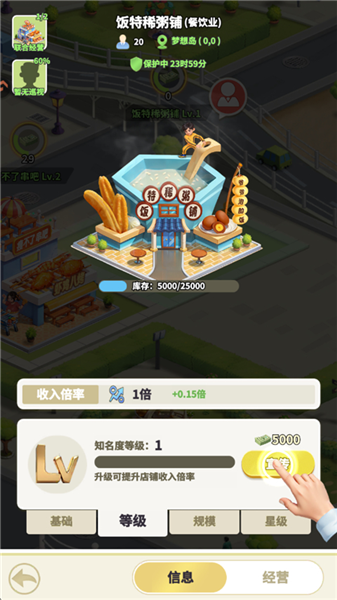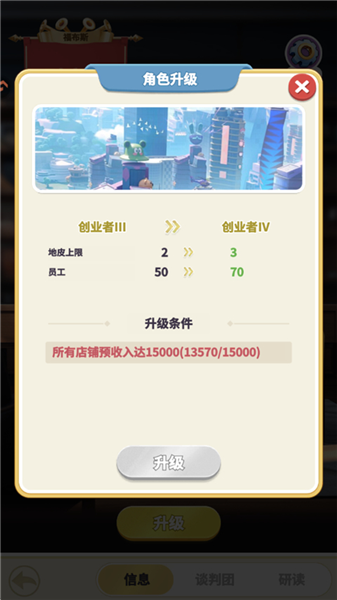 宣傳店鋪獲得知名后可升級(jí)店鋪,店鋪等級(jí)雖然不能帶來(lái)直接的加成,但是可以直接提升店鋪收入倍率提升,最多可以獲得3倍的店鋪收入!