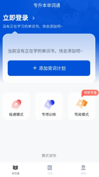 1、進入主頁即可添加背詞計劃,可根據需求設置極速模式或專項訓練模式;