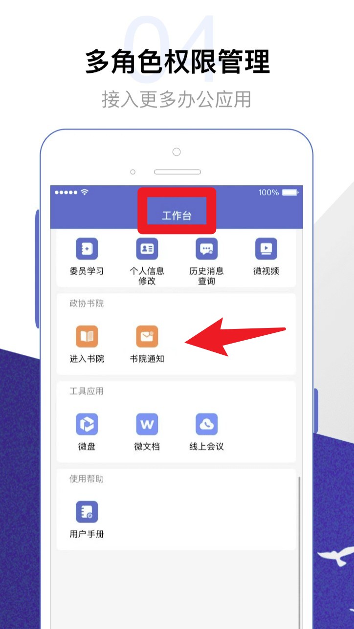 2. 點(diǎn)擊首頁(yè)工作臺(tái)可進(jìn)入各類功能區(qū),包括書院通知、委員學(xué)習(xí)、在線會(huì)議、微文檔等應(yīng)用。