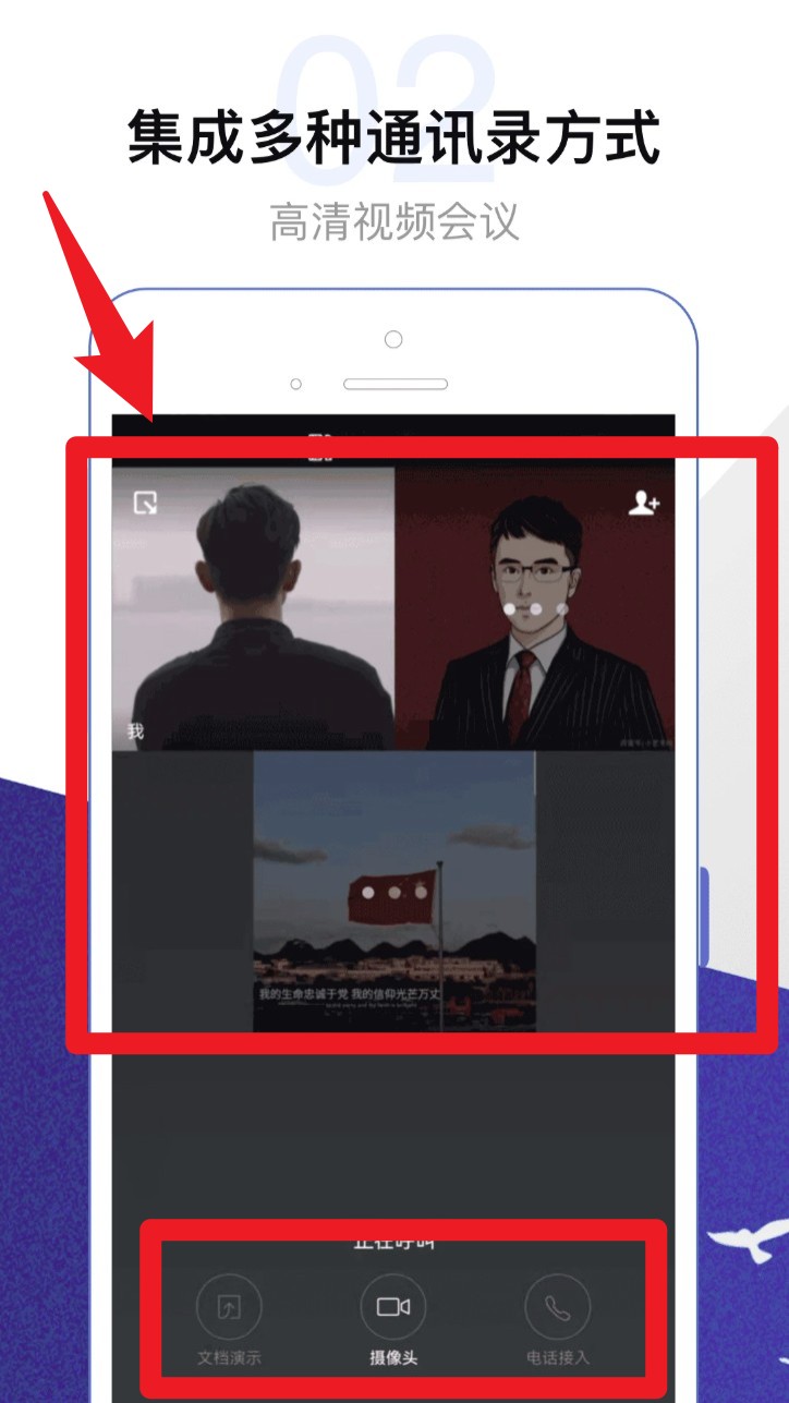4. 發(fā)起視頻會(huì)議后可選擇文檔演示、攝像頭共享或電話接入,支持多種通訊形式高效開會(huì)。