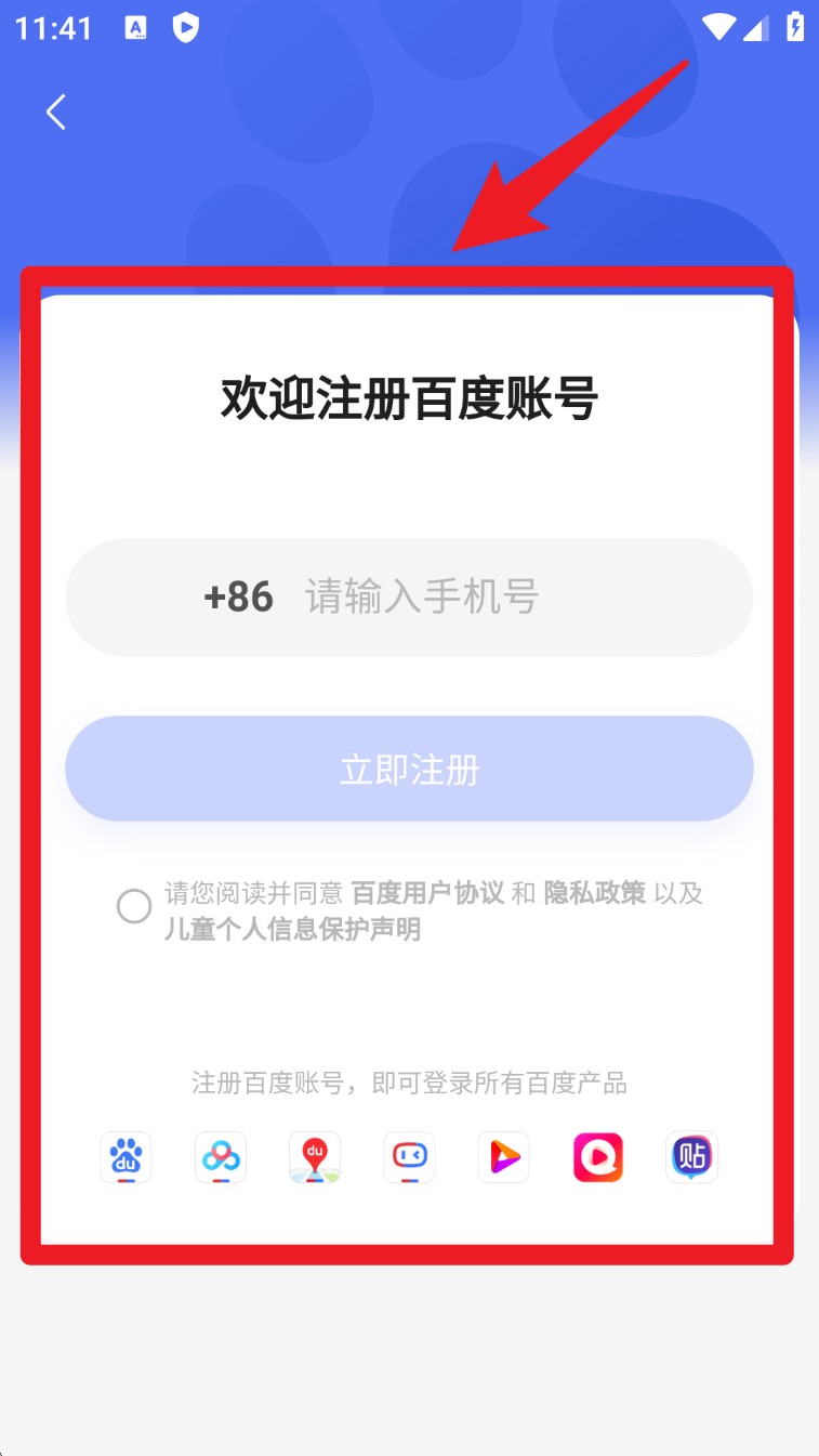1. 打開App進入注冊頁面,輸入手機號并勾選協議,點擊立即注冊創建百度賬號。
