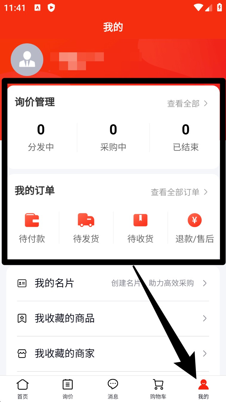3. 登錄成功后點擊底部導航欄我的,可查看訂單狀態、收藏商品與采購記錄等內容。