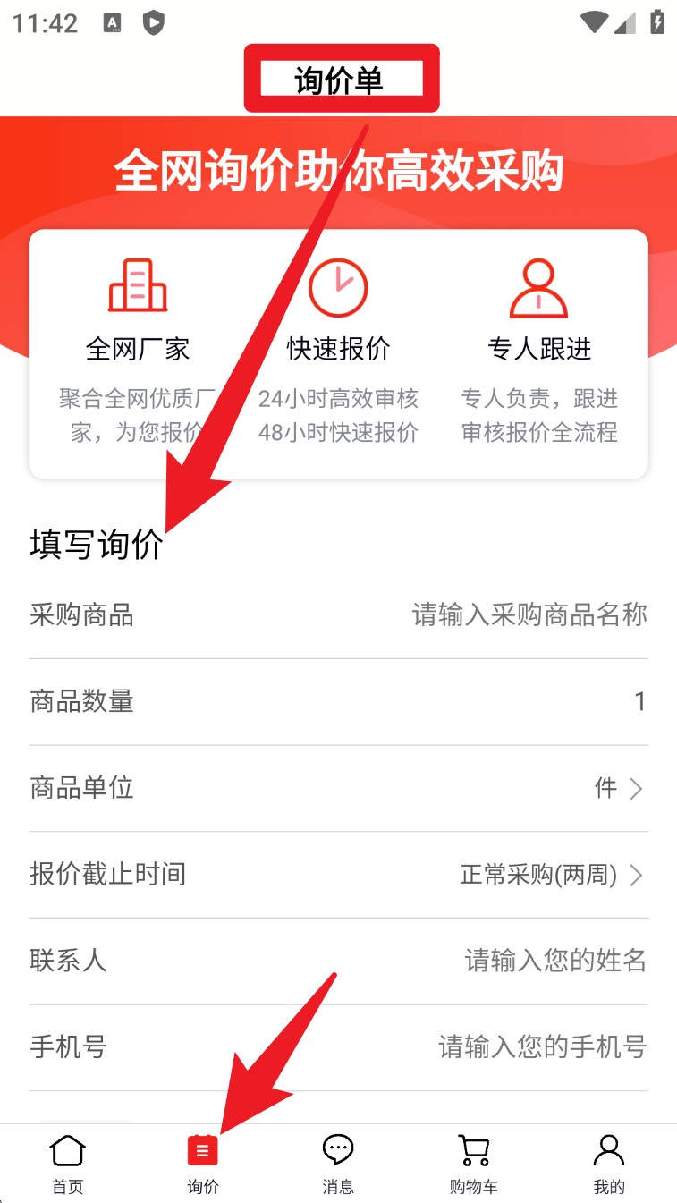 4. 點擊首頁或詢價菜單進入詢價單頁面,填寫商品名稱、數量等信息后提交詢價請求。