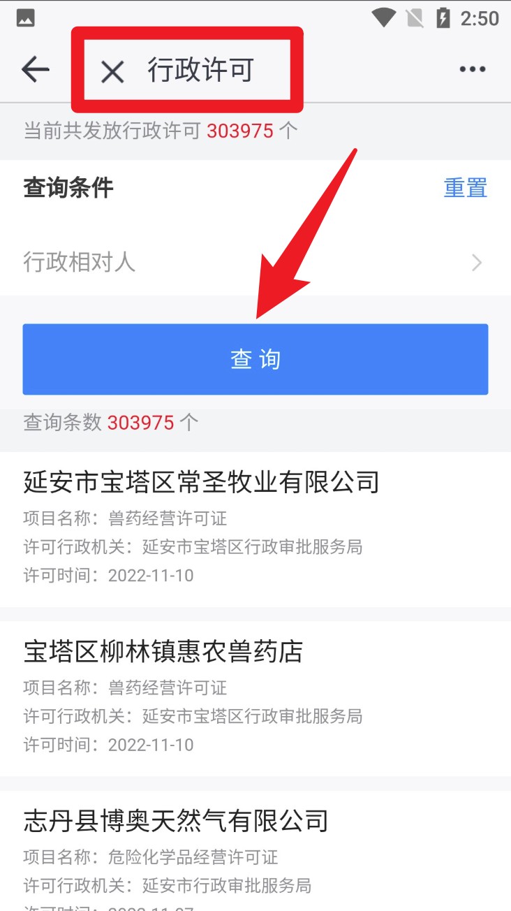 4. 點(diǎn)擊行政許可后輸入相關(guān)單位或法人名稱(chēng),點(diǎn)擊查詢(xún)即可查看對(duì)應(yīng)許可詳情。