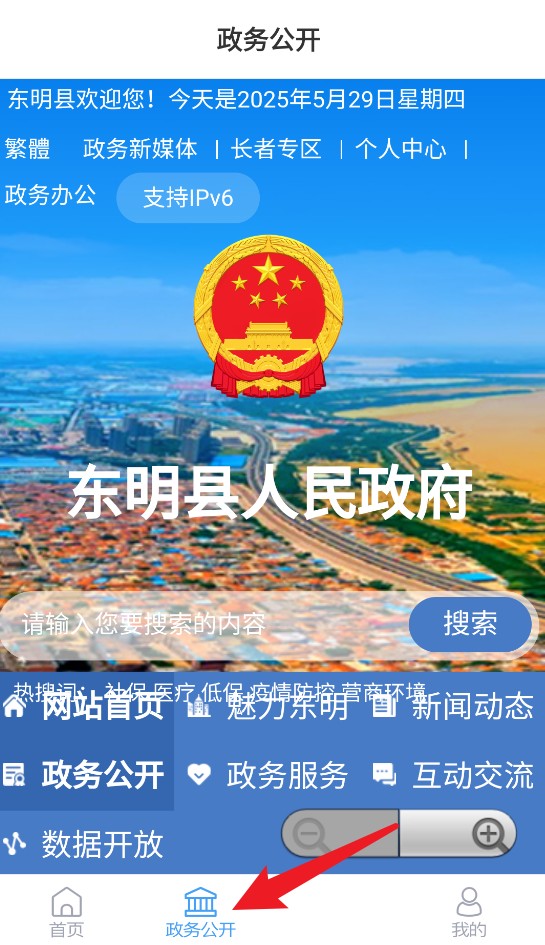 3、點擊下方菜單欄中的政務公開欄目,可進入東明縣人民政府頁面瀏覽政務信息和公開數據內容。
