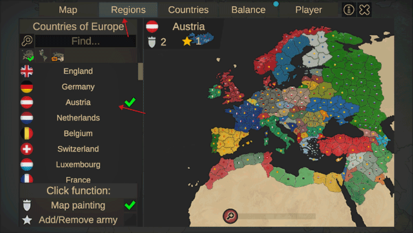 3、在regions里選擇一個你需要掌權(quán)的國家