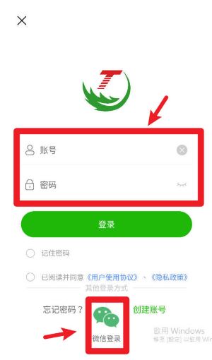 1、打開APP進入登錄頁,輸入賬號密碼或選擇微信登錄,勾選協議后點擊綠色按鈕進入系統。