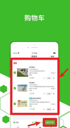 2、瀏覽藥品后加入購物車,進入購物車界面可調整購數量,確認后點擊底部提交訂單。