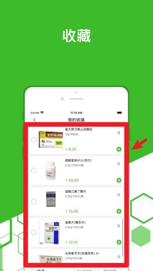3、在收藏頁面中可查看已收藏藥品,點擊右側加號圖標可直接將藥品加入購物車進行采購。