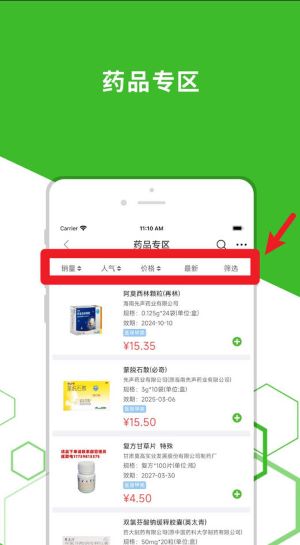 4、進入藥品專區,通過篩選功能可按分類、價格或熱度瀏覽藥品詳情,并快速加入采購清單。