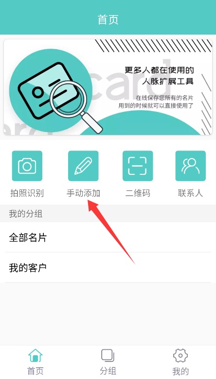 2、在首頁選擇手動(dòng)添加功能,進(jìn)入名片信息編輯頁面開始創(chuàng)建個(gè)人電子名片。