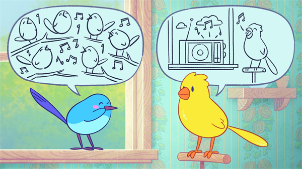 3、最后是一個(gè)關(guān)于寵物金絲雀與戶外鳥(niǎo)類對(duì)話的小游戲。這里,你在最后一拍發(fā)推,另一只鳥(niǎo)發(fā)推其余。有時(shí)候,當(dāng)對(duì)方一次發(fā)出三次推特后,你需要暫停一下,才能自己發(fā)推。你越是錯(cuò)過(guò)節(jié)奏,你的新朋友就越煩躁。教程和游戲開(kāi)頭會(huì)用字幕顯示球彈跳,用來(lái)模擬節(jié)拍,但很快就被淘汰了。