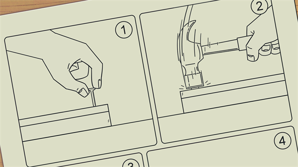 2、接下來(lái)是錘子時(shí)間,這是我在試玩中最吃力的小游戲。隨著一張平板家具說(shuō)明書(shū)出現(xiàn),你隨著節(jié)拍敲擊釘子,回應(yīng)著它們放置的節(jié)奏。更復(fù)雜的是,游戲偶爾會(huì)用一只幫忙的貓來(lái)掩蓋釘子放置或敲擊的部分,所以你得隨機(jī)應(yīng)變,嘗試了幾次后,我勉強(qiáng)拿到了“酷”的排名,但錯(cuò)過(guò)了很多釘子。