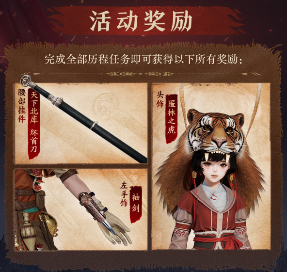 完成全部活動(dòng)歷程任務(wù)后,俠士還可獲得聯(lián)動(dòng)頭飾“匿林之虎”、左手飾“袖劍”及腰掛“天下北庫(kù)·環(huán)首刀”精美獎(jiǎng)勵(lì)。