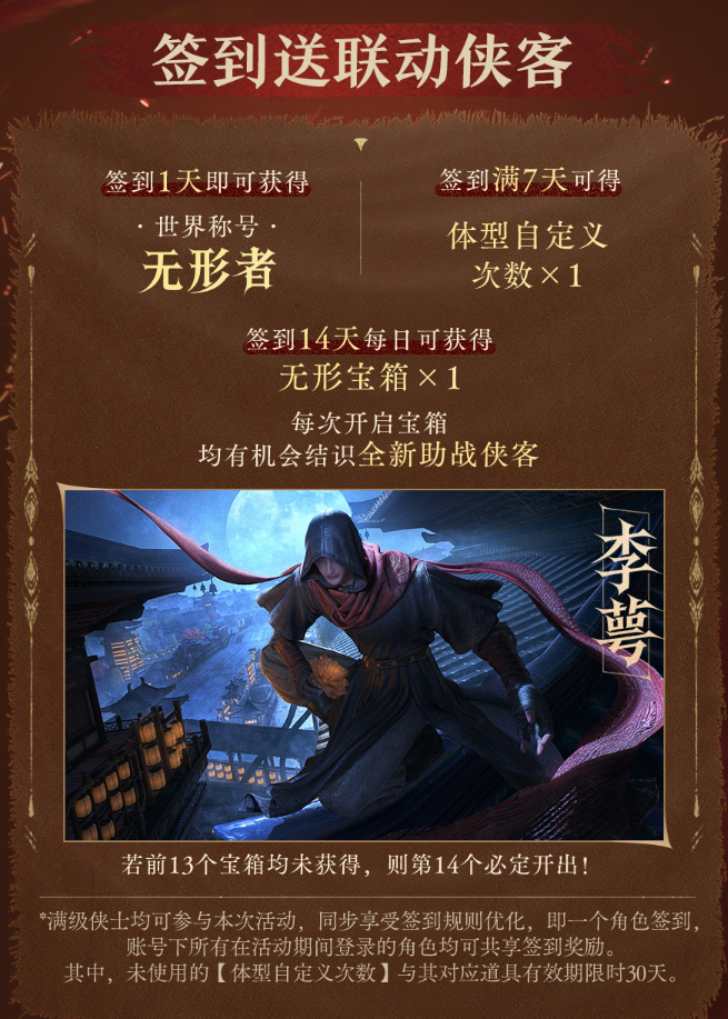 暗夜?jié)撣櫽半y覓,利刃閃處罪惡息,身陷囹圄之時(shí),何人能勘破死局?全新聯(lián)動(dòng)主題簽到活動(dòng)12月18日7:00至1月15日7:00開啟,全新聯(lián)動(dòng)稱號(hào)與體型自定義次數(shù)等好禮登場(chǎng),簽到十四天保底送助戰(zhàn)俠客“李萼”!