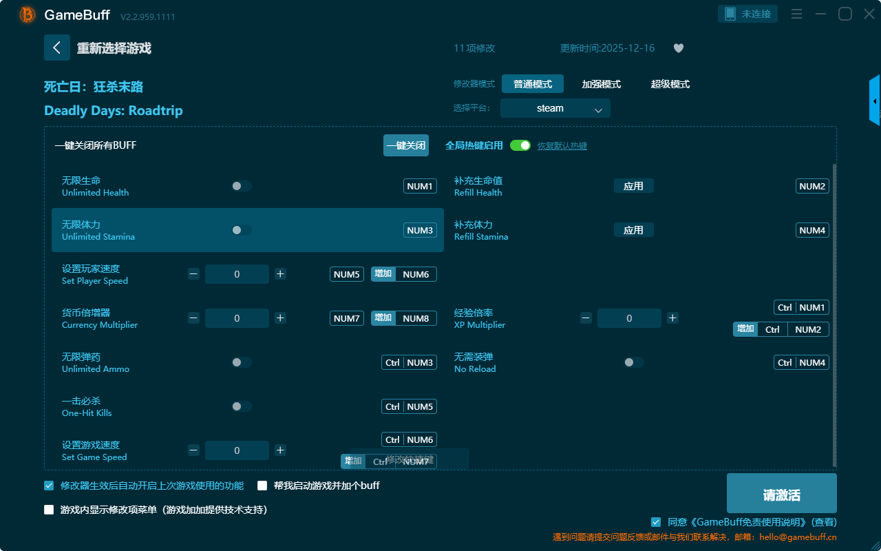 死亡日:狂殺末路十一項(xiàng)修改器是一款功能十分強(qiáng)大實(shí)用的游戲輔助修改器工具,操作也很簡(jiǎn)單,支持一鍵設(shè)置擁有無限生命、補(bǔ)充生命值、補(bǔ)充體力、經(jīng)驗(yàn)倍率、無需裝彈、貨幣倍增器、無限彈藥、一擊必殺、設(shè)置游戲速度、設(shè)置玩家速度、無限體力等十一項(xiàng)功能內(nèi)容,感興趣的玩家千萬不要錯(cuò)過哦!