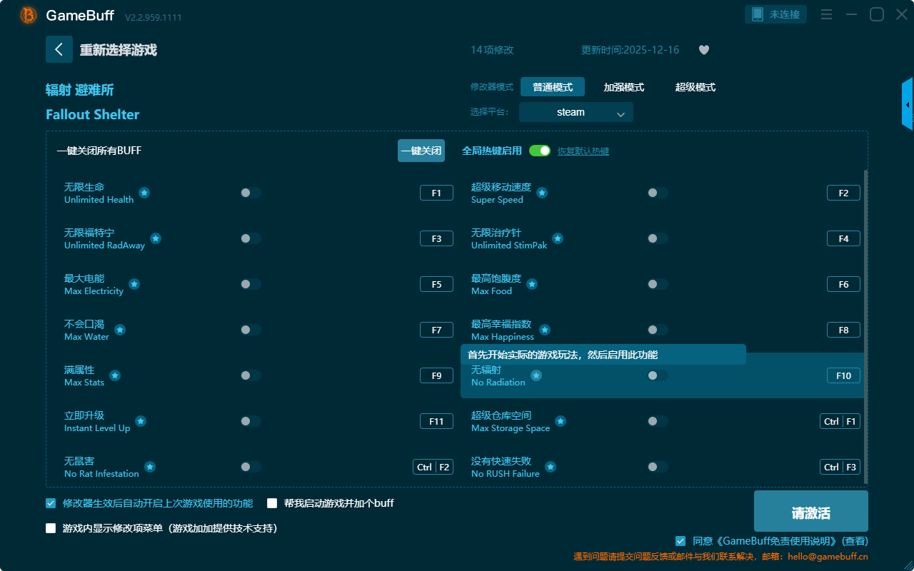 輻射:避難所十四項修改器是一款可以自由設(shè)置擁有無限生命、超級移動速度、最高飽腹度、最高幸福指數(shù)、無輻射、超級倉庫空間、沒有快速失敗、立即升級、最大電能、不會口渴、滿屬性、無限治療針等十四項功能內(nèi)容,帶領(lǐng)自己沉浸式體驗游戲的樂趣,感興趣的玩家千萬不要錯過哦!