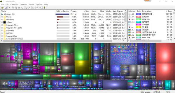 2、以彩色矩形圖譜展示文件夾結(jié)構(gòu),顏色區(qū)分類型,面積對(duì)應(yīng)占用空間,快速定位大文件夾;