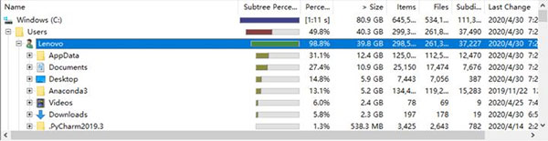 3、目錄樹(shù)界面顯示文件夾體積、文件數(shù)量、空間占比等數(shù)據(jù),全面呈現(xiàn)磁盤使用狀態(tài)。