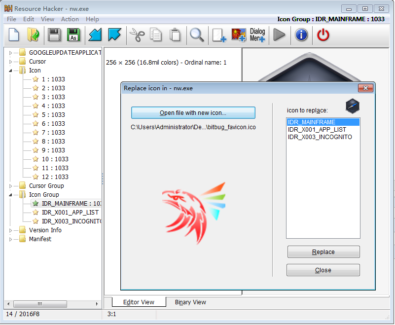 3、修改資源:直接替換圖標(biāo)等資源,編輯菜單、對話框,調(diào)整對話框控件;